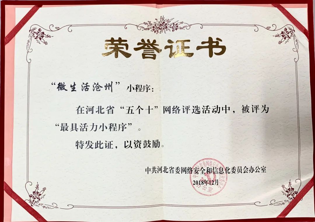 自2017年11月上線以來,得到了廣大網(wǎng)友的認(rèn)可和關(guān)注,在團(tuán)隊(duì)的精心運(yùn)營下,于2018年12月份榮獲由中共河北省委網(wǎng)信辦主辦、河北廣播電視臺新媒體中心承辦,在全省范圍內(nèi)挖掘好網(wǎng)絡(luò)文化產(chǎn)品、選樹正能量網(wǎng)絡(luò)人物、傳播正面主流聲音,為新時代建設(shè)經(jīng)濟(jì)強(qiáng)省美麗河北凝聚強(qiáng)大網(wǎng)絡(luò)正能量的《河北省“五個十”網(wǎng)絡(luò)評選》中“最具活力小程序”榮譽(yù)。于2019年7月份榮獲由中共滄州市委網(wǎng)信辦和滄州市網(wǎng)絡(luò)媒體協(xié)會共同頒發(fā)的“滄州市2018年度優(yōu)秀新媒體(自媒體)信息傳播平臺”榮譽(yù)證書。